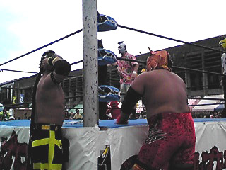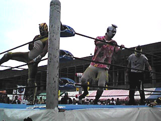 全員覆面レスラーで各市町村の特産品になっているんだけど、なんてったってゴールデンパインがインパクト強かった。まさかのおかまレスラー。パインの登場と共にリングアナが「男性のお客様は注意してください、目を合わせないようにしてください!」と注意を促してました(笑)