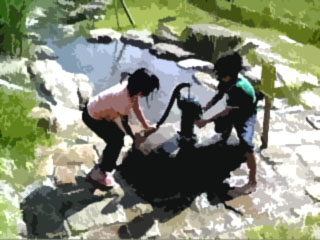 ←これが田んぼの側にある溜池と手押し井戸ポンプ。甥姪もろ写りなので、ちょっと加工しました。そして川。→