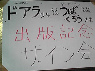サイン会の内容は、発売されたばかりの「ドアラのへや」とヤクルトのマスコットキャラつば九郎による「つば九郎のおなか」を買った人のみ、本へのサインOKというものでした。