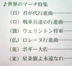 世界のマーチ特集ということで、日・露・独・仏・英・米のマーチの演奏がありました。もうこのお題目見ただけでもえた!そして伊と中があれば枢軸と連合国が揃うのに…!と残念に思った。