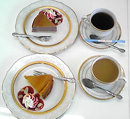 ふたりしてケーキセットを頼んだ。パッと見同じように見えるが、多くは紅芋ケーキ、手前はチーズケーキなのですよ。