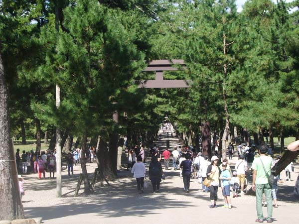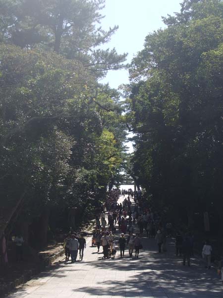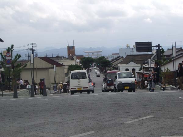 ③二の鳥居から神門通りを眺める。空が広く見渡せていい場所。でも案外交通量多い。両脇には土産物屋や飲食屋が立ち並んでて、観光場所だな~って感じ。奥に見える大きな鳥居は一の鳥居。
