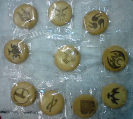 テレビ朝日の近くでライブがあったらしく、お土産にテレ朝のお菓子とか買ってきていたんですね。んで、会社の皆とは別に、シンケンジャーのクッキーも買ってきたと!1枚1枚にあの仮面のイラストが描かれていると!