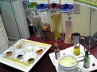 このホテルのパスタバイキングは、トレイのところに麺とソースの見本が数種類置かれてあって→、担当の人が各お客さんの注文を聞いて席まで持ってきてくれる形式でした。なんかお洒落な感じでしたよ。